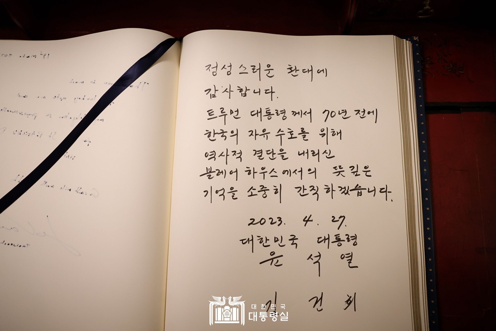 한편 국빈방문 기간 동안 대통령 부부에게 숙소로 제공된 블레어하우스(영빈관)를 떠나며 윤석열 대통령은 방명록에 ”정성스러운 환대에 감사합니다. 트루먼 대통령께서 70년 전 한국의 자유 수호를 위해 역사적 결단을 내리신 블레어하우스에서의 뜻깊은 기억을 소중히 간직하겠습니다"라는 글을 남겼습니다.