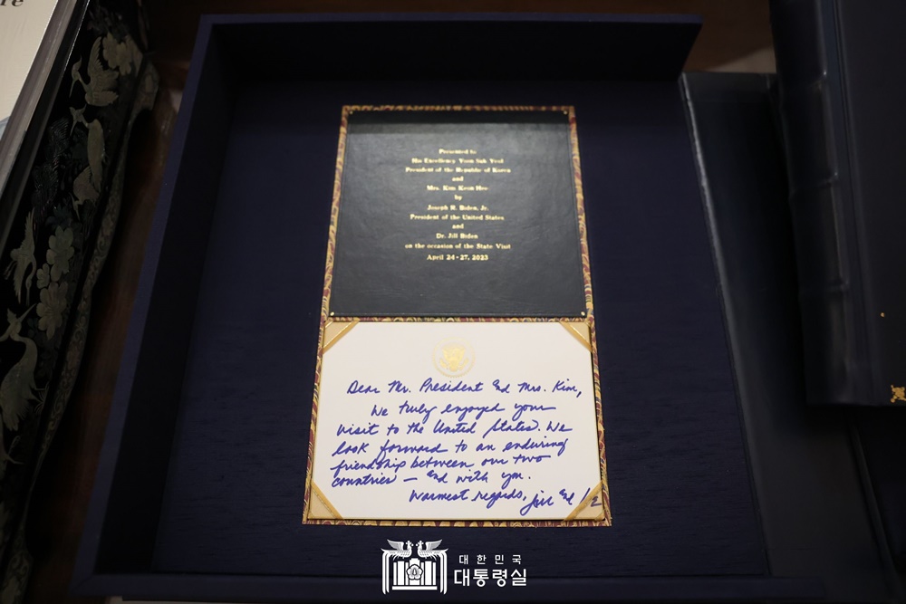 대통령 부부가 미국에 도착해 친교의 시간을 갖고 정상회담과 국빈만찬을 함께 한 3박4일간의 여정이 담긴 사진첩에 동봉된 메모에는 “윤 대통령님 내외분의 미국 방문은 저희에게도 진심으로 즐거운 시간이었습니다. 양국 간 그리고 우리들 사이의 우정이 더욱 증진되기를 고대합니다."라는 내용이 바이든 대통령의 친필로 적혀 있었습니다.