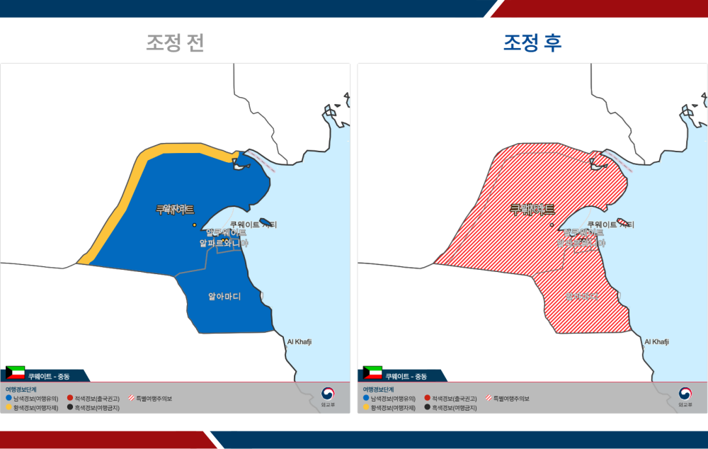 - 쿠웨이트: 1단계(여행유의) 및 2단계(여행자제) → 전역 특별여행주의보