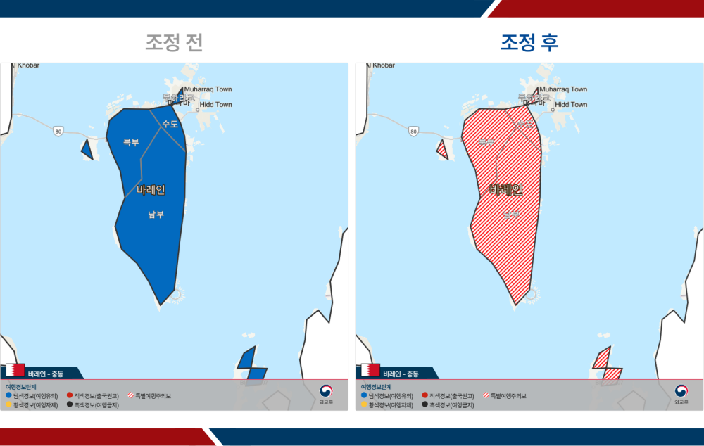 - 바레인: 1단계(여행유의) → 전역 특별여행주의보